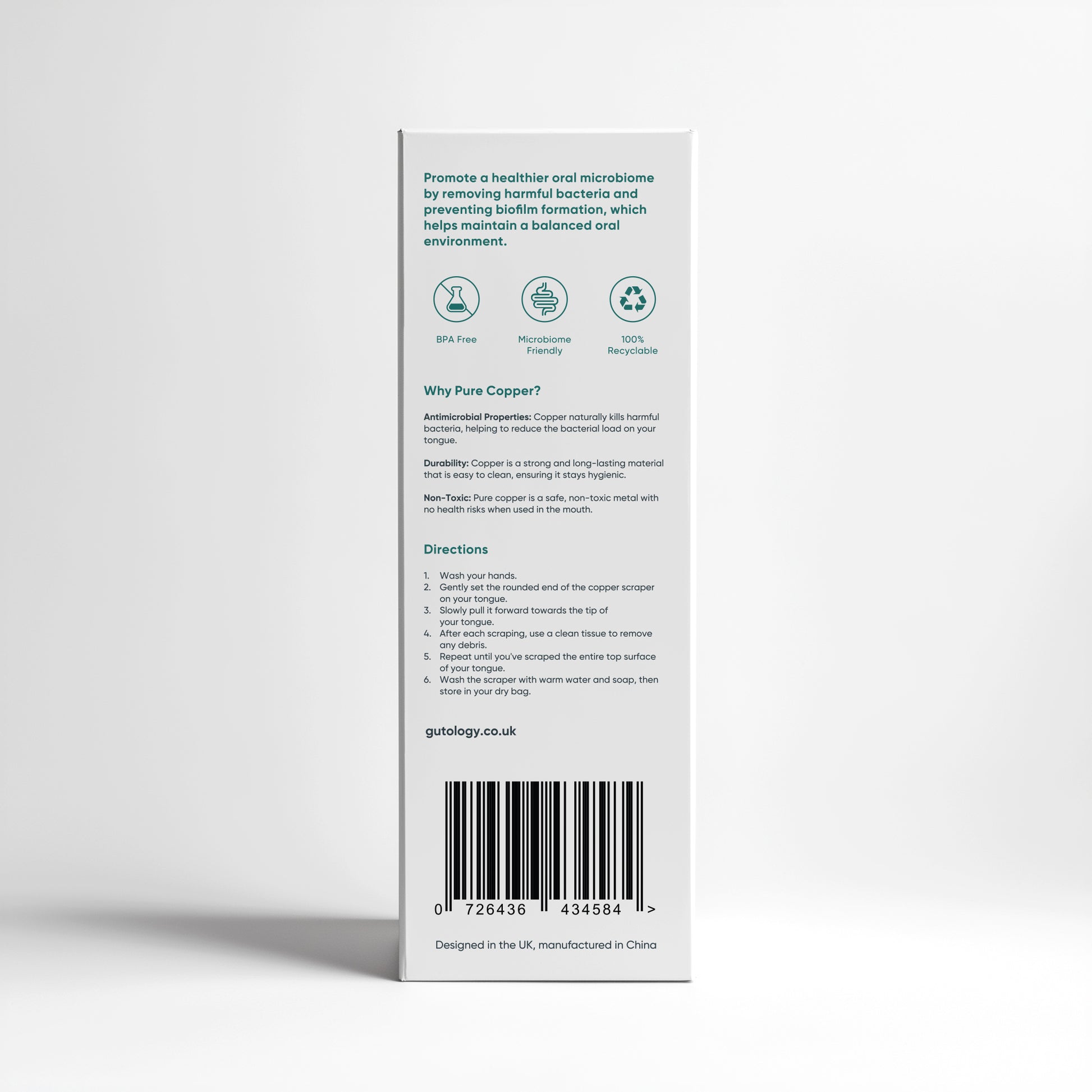 The Gutology Tongue Scraper is crafted from 100% pure copper, a natural, antibacterial metal known for its durability and oral health benefits.